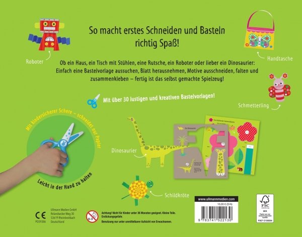 In unserem Schneide- und Bastelbuch geben über 30 Bastelvorlagen Kindern ab drei Jahren die Möglichkeit, sich kreativ auszutoben und fördern zudem ihre Konzentration und Feinmotorik. Diese ist unter anderem für das spätere Schreibenlernen sehr wichtig. Basteln schult außerdem das logische und räumliche Denken und regt Kinder dazu an, sich länger mit einer Aufgabe zu beschäftigen, was eine bessere Ausdauer mit sich bringt. Unser Schneide- und Bastelbuch bietet altersgerechte Herausforderungen kreativer Art und trainiert das Gehirn. Die optimale Form, ihr Kind auf spielerische Weise in seinem Entwicklungsprozess zu unterstützen! Liebevoll illustrierte Motive in unserem Schneide- und Bastelbuch sorgen darüber hinaus für den maximalen Bastelspaß, sodass die Zeit wie im Flug vergeht. Eine kindersichere Schere gibt es gratis dazu. Diese schneidet ausschließlich Papier und ist ideal für kleine Kinderhände.