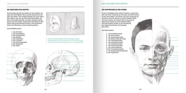 • Die zentralen Themen kurzgefasst: Geometrie, Zeichen- und Schraffurtechniken, Stillleben, Maßnehmen, Porträt, Akt, Anatomie (Muskeln, Knochen), Fixieren, Rahmen